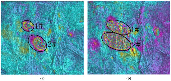 The topographic phase in the interferogram was filtered by external DEM. The interferogram was filtered using the Goldstein algorithm to reduce the coherence noise, and the corresponding coherence coefficient diagram was obtained. Using the high-coherence points in the obtained diagram, the phase unwrapping was realized through the minimum cost flow algorithm, and the images with poor unwrapping effect were removed. Two filtered interference graphs in the experiment were selected for analysis, as shown in Figure 13. From Figure 13a, it can be seen that, from January 2019 to March 2019, deformation regions 1# and 2# appeared. Compared with deformation region 2#, deformation region 1# had smaller shape variables and influence scope. As can be seen from Figure 13b, with the passage of time, the scope of deformation region 1# and 2# gradually expanded, and the color became darker and darker, indicating that the scope and vertical deformation magnitude of the two deformation regions were gradually expanding.