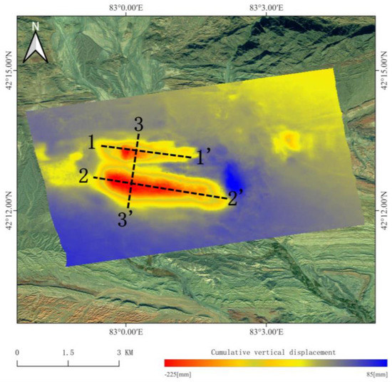 In order to further analyze the development of the deformation area in the time domain, three measuring lines were drawn in the area with large ground deformation above the mined-out areas. Among them, the 1–1′ measuring line and 2–2′ measuring line were disposed along the working face dip, and the 3–3′ measuring line was disposed along the working face strike. A number of displacement monitoring points were arranged on the 1–1′ and 2–2′ measuring lines at equal intervals from left to right, and on the 3–3′ measuring lines at equal intervals from top to bottom, focusing on monitoring the deformation area of 1# and 2#. The layout of measuring lines is shown in Figure 14. Finally, according to the deformation information of each monitoring point, the time series vertical displacement curves and cumulative vertical displacement curves of the three measurement lines were drawn, and the time series analysis was conducted. The time series vertical displacement and cumulative vertical displacement of the measuring lines are shown in Figure 15, Figure 16 and Figure 17.