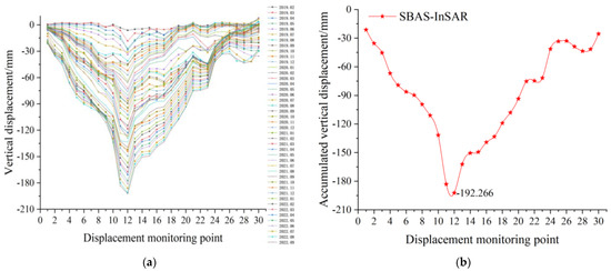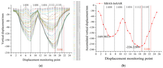 Vertical displacement curve of the 1–1′ measuring line: (a) time series vertical displacement curve; (b) accumulated vertical displacement curve.