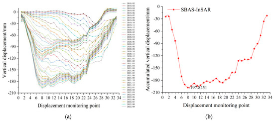 Vertical displacement curve of the 2–2′ measuring line: (a) time series vertical displacement curve; (b) accumulated vertical displacement curve.