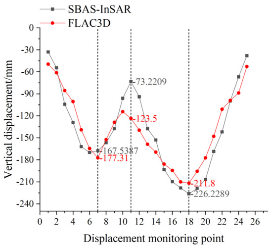 The cumulative vertical displacement from 2019 to 2022 obtained by SBAS-InSAR technology (Figure 17b) was compared with the ground-based vertical displacement increment from 2019 to 2022 caused by mining in the 1408 and 5106 working faces (Figure 6) obtained by FLAC3D, and the results are shown in Figure 18. It can be found that the ground vertical displacement curves obtained by the two methods showed a similar trend, and the degree of fitting was high. The vertical displacement errors of the No. 7 and No. 18 monitoring points with the largest cumulative vertical displacement obtained by SBAS-InSAR technology and the corresponding positions of the numerical model were 5.48 mm and 14.42 mm, respectively. The maximum error of the two curves was 50.27 mm (No.11 monitoring point), meeting the accuracy requirements of ground deformation monitoring, and proving that the numerical simulation model is accurate and reliable. It can provide a favorable guarantee for the later use of the mined-out area stability analysis using numerical simulation and the prediction of the impact of repeated mining on ground deformation in the mining area.