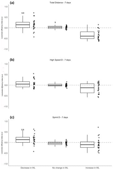 To better understand the effects of training load, we examined the relationship between LEI and weekly load variation. In particular, we considered the workload accumulated in the previous 7 days (total distance, distance > 19.8 km/h, distance > 25.2 km/h, and number of accelerations and number of decelerations). Considering that workload can change from player to player depending on different factors (e.g., playing position), it was individualized using z-score transformation. Three different conditions were identified: (D-WL), the player experienced a decrease in weekly load compared to normal (z-score < −1); (S-WL), the load remained within a normal range (z-score between −1 and 1); and (I-WL), the player experienced an increase in weekly load compared to normal (z-score > 1). When players registered an increase in weekly load (I-WL) for total distance (ES 0.20–0.63), distance > 25.2 km/h (ES 0.56–0.82), and number of accelerations (ES 0.10–0.32), a significant decrease in LEI was observed. (Figure 6). A similar approach was adopted in a previous study, wherein the authors found an association between a higher acute load and an increase in fatigue [24]. As stated by Hader et al. [32], a high volume of total distance, a very high-intensity running distance, and the number of accelerations could be associated with repeated eccentric muscle contractions, muscle damage, and disturbances in the biochemical milieu, consequently increasing the fatigue state. As such, the use of the LEI could support daily practitioners in assessing players that are responding properly to variations in training load and those that present decreased neuromuscular status; in turn, this would support better workload management for elite soccer players.