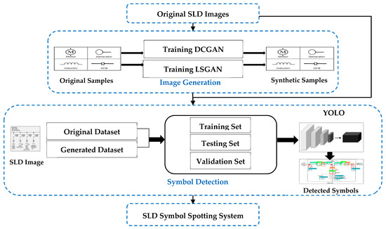 In numerous electrical power distribution systems and other engineering contexts, single-line diagrams (SLDs) are frequently used. The importance of digitizing these images is growing. This is primarily because better engineering practices are required in areas such as equipment maintenance, asset management, safety, and others. Processing and analyzing these drawings, however, is a difficult job. With enough annotated training data, deep neural networks perform better in many object detection applications. Based on deep-learning techniques, a dataset can be used to assess the overall quality of a visual system. Unfortunately, there are no such datasets for single-line diagrams available to the general research community. To augment real image datasets, generative adversarial networks (GANs) can be used to create a variety of more realistic training images. The goal of this study was to explain how deep-convolutional-GAN- (DCGAN) and least-squares-GAN- (LSGAN) generated images are evaluated for quality. In order to improve the datasets and confirm the effectiveness of synthetic datasets, our work blended synthetic images with actual images. Additionally, we added synthetic images to the original picture collection to prepare an augmented dataset for symbol detection. In this scenario, we employed You Look Only Once (YOLO) V5, one of the versions of YOLO. The recognition performance was improved, reaching an accuracy of 95% with YOLO V5, after combining the actual images with the synthetic images created by the DCGAN and LSGAN. By incorporating synthetic samples into the dataset, the overall quality of the training data was improved, and the learning process for the model became simpler. Furthermore, the proposed method significantly improved symbol detection in SLDs, according to the findings of the experiments.