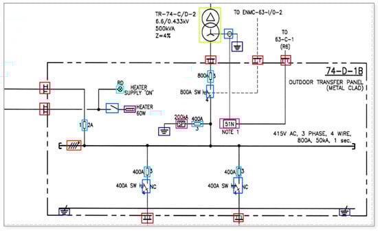 There are numerous industries in which engineering documents continue to exist in paper format due to a lack of digitalization for automated systems [1]. Among such documents, single-line diagrams (SLDs) pose a significant challenge in terms of interpretation and comprehension, as exemplified in Figure 1. These technical documents play a crucial role in diverse fields, including electrical systems, power distribution systems, hazardous area layouts, and other structural layouts. Deciphering these drawings often requires a considerable amount of time and the expertise of highly skilled engineers and professionals [2,3].