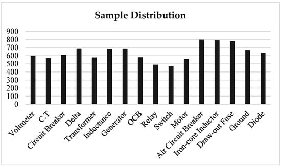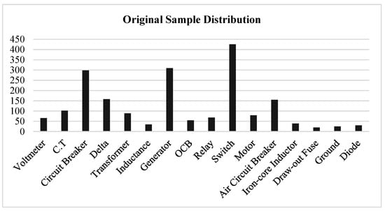 The data that resulted from the annotation were saved in a file that represented the 16 unique classes. The center of the bounding boxes’ x and y values, as well as the widths and heights of the symbols that the bounding boxes enclosed, were captured as data. The collection of 600 images, which included 1953 samples representing 16 various sorts of symbols, was annotated. As can be seen in Figure 8, the original sample was incredibly unbalanced.