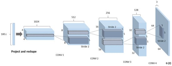 Due to their poor suitability for storing positional data, DCGANs do not include linear layers or pooling layers. Instead, convolutional networks make up the networks used by DCGANs. The other advantage of a DCGAN is that, when the input data’s layer distribution is biased, it employs batch normalization to correct the mean and variance. The network keeps stacking the convolutional layers until reaching the shape 32 × 32 × 3 with the final transposed convolutional layer, as shown in Figure 9.