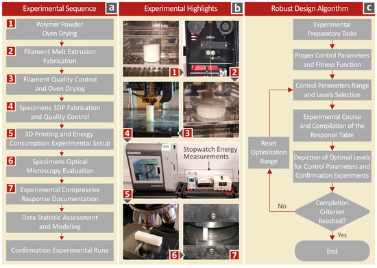 The methodology used in the present investigation is depicted in Figure 1. More particularly, Figure 1a illustrates the stages of the method used for the specimens’ preparation, assessment, and characterization, as well as the evaluation of the experimental results of the present study. Pictures from the trial-based course are shown in Figure 1b. In particular, Figure 1b shows: how the raw material was dried (PA6 Novamid N X 160 pellets acquired from DSM Engineering Materials at 60 °C for 24 h) in subfigure no 1, the extrusion of filament using a 3devo precision single screw extruder from the Netherlands’ Utrecht (filament’s diameter 1.75 mm, first and fourth heat zones: 190 °C, second and third heat zones: 220 °C, 3.50 rpm, fan: 80.0%) in subfigure no 2, the drying process of the created filament (4 h at 60 °C) in subfigure no 3, and 3D printing of the samples in agreement with ASTM D695-02a standard (five replicas for each set of 3D printing settings, using an Intamsys 3D Printer, Funmat HT, from Shanghai, China) in subfigure no 4. The 3D printing procedure’s parameters are displayed in Figure 2. The energy assessments conducted during the 3D printing procedure employing a digital multimeter Rigol DM-3058E (RIGOL Technologies, Shanghai, China) are presented in subfigure no 5 of Figure 1, the examination of the specimens’ morphology using an optical microscope (Kern OKO-1, Germany; 5-MP type with ODC-832 camera) in subfigure no 6 of Figure 1, and the evaluation of the specimens’ compressive strength (Instron KN-1200 universal testing machine, from Norwood, Massachusetts, USA) in subfigure no 7 of Figure 1. The robust design algorithm implemented in this study for the optimization and evaluation of the experimental findings is shown in Figure 1c.