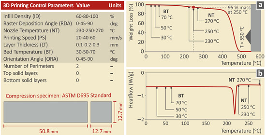 Values for 3D printing parameters and the compression test sample’s geometry made in accordance with ASTM D695 specifications are shown. The right side of the figure shows (a) a TGA graph of the weight loss versus temperature for the particular PA6 utilized in the study and (b) a DSC graph.