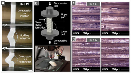 (a) A 3D printed specimen’s compression test stages up to delamination failure due to buckling (Runs 19), (b) graphical representation and microscopic examination of the fractured surface, (c,d) Micrographs of two corresponding samples’ upper- and lower-fractured surfaces (Run 11, 12) that failed by shear sliding.