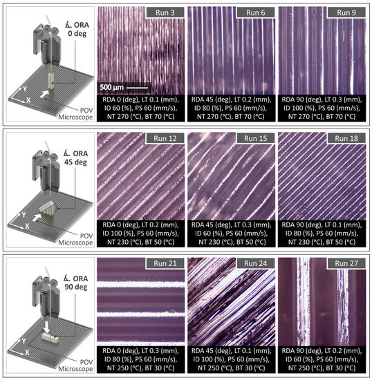 Figure 4 shows microscopic images that were captured from the top surface of specimens that were fabricated using various control parameter settings. Since each specimen was 3D printed using different 3D printing settings, the distinction between the created structures is clear. Every image displays the texture of the 3D-printed specimen from the run mentioned in the image. As shown, excellent layer fusion is presented in the images, with layers having a uniform shape and no defects or voids visible. This indicates that the settings were appropriate for the PA6 specimens’ 3D printing with the MEX method. For a presentation of one microscopic image from each one of the 27 experimental runs, please see the paper’s supplementary material (Figure S2).