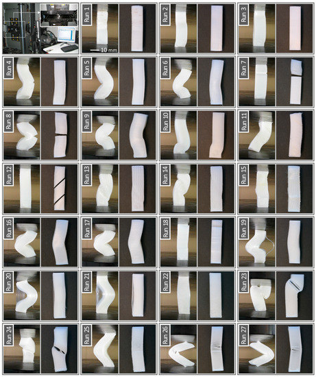 The samples that underwent a compression test in accordance with ASTM D695 are shown in Figure 5. Depending on the results of the compression experiments, a categorization of the compressive failure types can be determined. The resulting compressive modes of failure due to these tests can be classified into three primary failure categories that are each split into subcategories. The main categories are flexural buckling, kinking, and shear failures. The first and most common type is flexural buckling failure, which involves three distinct sub-modes: lateral buckling (runs 4, 5, 6, 9, 16, 17, 18); interlaminar delamination causes buckling (runs 19, 20, 21, 22), interfacial debonding and buckling (runs 7, 8, 25, 26, 27); and buckling associated with twisting around the longitudinal axis (runs 11, 13, 24). The kinking failure is the second one, either with a single (run 10) or double (runs 1, 2, 3, 14, 15) kink, and the third failure mode is shearing failure with sliding (runs 12, 23).