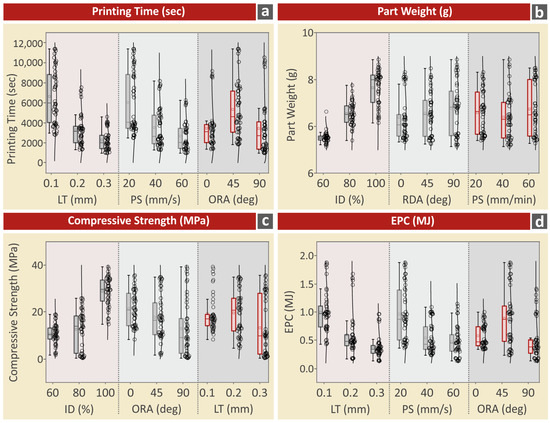 Box plots showing the relationship between the response and the work’s control parameters: (a) Printing time vs. PS, LT, ORA; (b) Part weight versus ID, RDA, ORA; (c) Compressive strength versus ID, ORA, RDA; (d) EPC versus PS, LT, ORA.