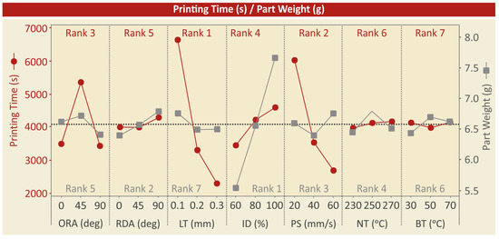 Main Effect Plots (MEP) were also created using the experimental data shown in the tables above. The MEP are shown in Figure 7 and Figure 8 for the work’s most important response parameters. Please refer to the work’s supplemental information for extra MEP graphs for the other response factors that were examined in this study (Figures S3 and S4). The MEP provides details on how each control parameter affects a certain response factor. In addition, the significance of the control parameters for a particular response parameter was graded (from most essential to least important). According to Mostafa et al. [87], the ranking depends on the study of the mean of means and the signal-to-noise ratio. All of the control parameters have a negligible impact on the particular response factor, according to the MEP for the Part Weight (g) (Figure 7), except ID (%), with the increase of it leading to an increase in part weight. The LT and PS control factors have a significant impact on the MEP for the Printing Time (PT), with their rise having the desired effect of causing a decrease in PT. The most important criteria for the PT are LT and PS, which are classified as no. 1 and no. 2, respectively. For the ID, the converse effect occurs: when the ID rises, the PT rises as well. When the ORA factor is between 0° and 90°degrees, reduced PT is given; when the ORA factor is between 45° and 90°degrees, higher PT is reported. NT, RDA, and BT have no considerable impact on PT.