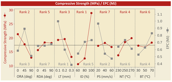 Plots of the compressive strength and the energy in relation to the work’s control factors.