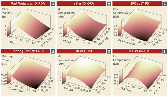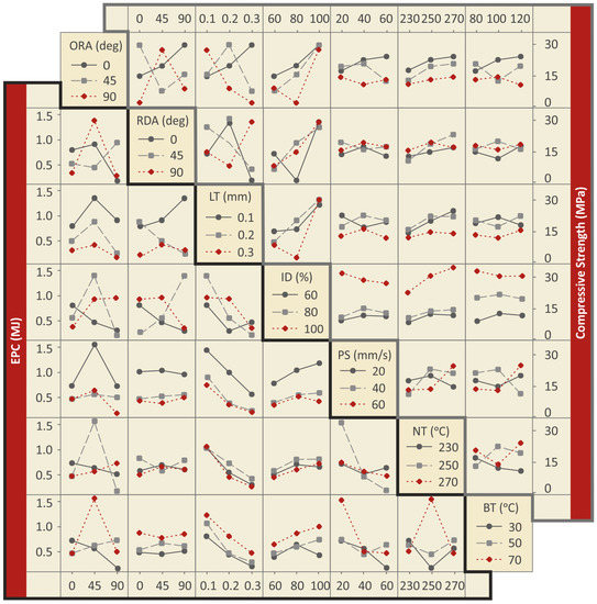 For Compressive Strength (MPa), Toughness (MJ/m3), Modulus of Elasticity (MPa), and Weight (g) response settings, Table 2 shows, for each individual run, the average values and standard deviations. The response components related to energy, alongside their average values and standard deviations (Printing Time, SPE, EPC, and SPP), are shown in Table 3 (the deviation presented is the calculated one from the experimental results. It refers only to the specific data, so there is no coverage factor). Please consult the supplementary file for more information about the experimental findings from the completed experiments that are presented (Tables S1 and S2). It should be noted that the average values of the printing time were calculated from the values of the measured printing time for each repetition of each run. The average values come from the five measurements in each run for the printing time. These values are presented analytically in Table S2 of the supplementary material of the study. The printing time measurements were integer numbers without decimal parts since there was no point in measuring the fragment of the seconds. Therefore, it is not strange that most of the average values are also integer numbers. As expected, this is not the case for their deviation.