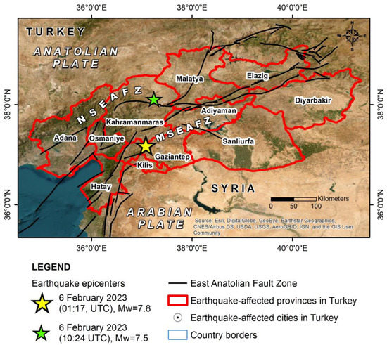 The epicenters of the 6 February 2023 earthquakes along the East Anatolian Fault Zone (EAFZ) based on the United States Geological Survey (USGS) [9,10]. The Mw = 7.8 was generated in the main strand of the EAFZ (MSEAFZ) and the Mw = 7.5 earthquake in the northern strand of the EAFZ (NSEAFZ). 11 provinces were affected by the earthquakes with their largest cities heavily affected by the earthquake ground motion and related primary and secondary effects resulting in tens of thousands of fatalities.