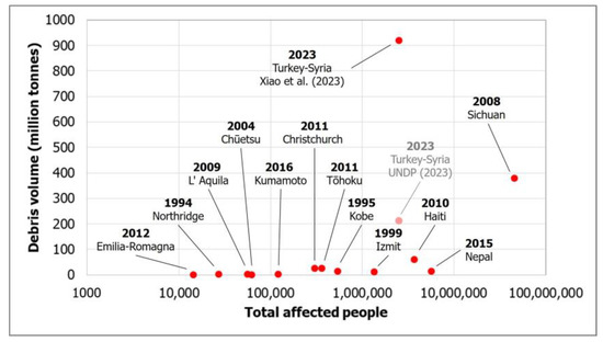 Debris volumes (in million tonnes) generated by earthquakes worldwide from 1994 to 2023 against the total affected people based on the data presented in Table 2. The maximum estimated volume is taken into account for each seismic event. The diagram contains data from 1994 to 2023 including the 2023 Turkey-Syria earthquakes based on Xiao et al. [53] and UNDP [52].