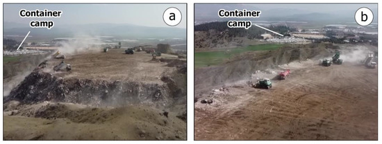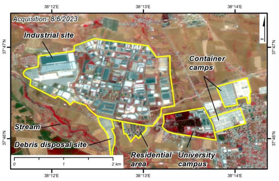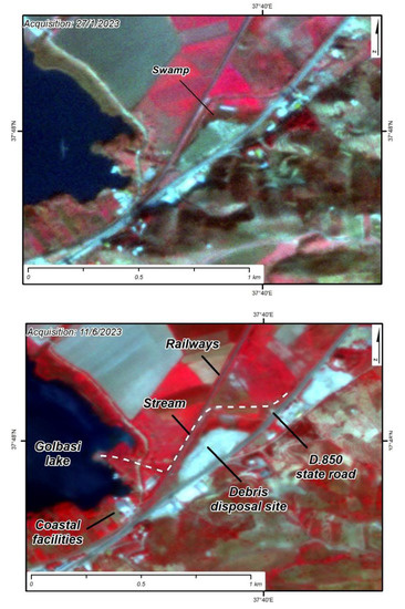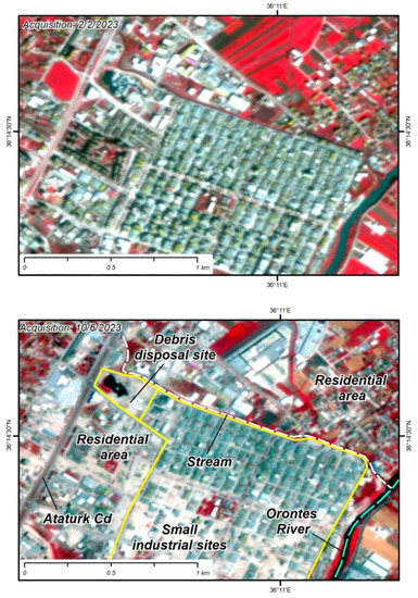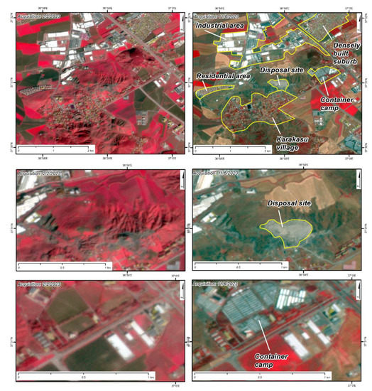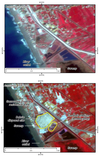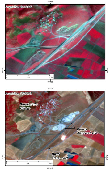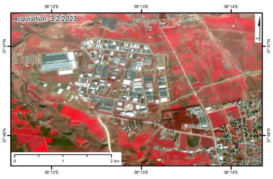 We used imagery acquired by the Planetscope satellite constellation [18], which was kindly offered for our research through the online explore platform. By using these datasets, we succeeded in working with high spatial resolution images (3 m), took advantage of the near-infrared band in addition to the visual spectrum, and finally chose cloud-free days, due to the high frequency revisiting time. The near-infrared band (845–885 nm) was assigned to the Red color, the red band (650–680 nm) was assigned to the Green color, and the green band (547–583 nm) was assigned to the Blue color, generating pseudocolor image maps. The latter provides a nice contrast between areas that are covered with vegetation due to the high reflectance of chlorophyll and objects on the earth’s surface that consist of concrete (buildings damaged or not, disposal sites), asphalt (paved roads, debris) or synthetic material (tents, containers, hovels) [19,20,21]. These remote sensing observations included multi-temporal, geo-referenced imagery interpretations of the same areas acquired some days before the February earthquake and almost four months later. The purpose of using these methodologies was to capture the dimensions, the properties, and the actions that were taking place within these sites and the potential presence of human activity and structures (buildings and infrastructure) as well as natural ecosystems that could be adversely affected by the operation of these sites.