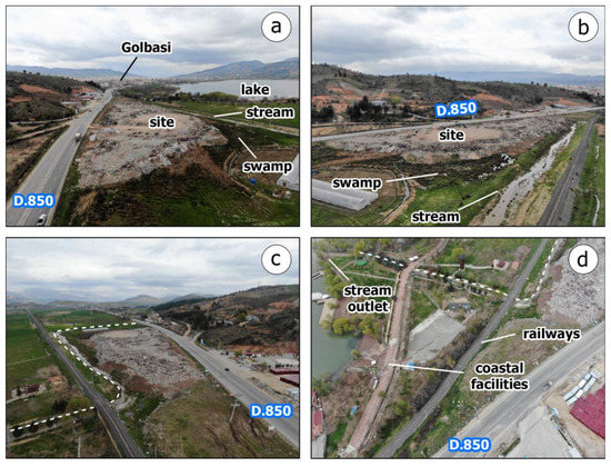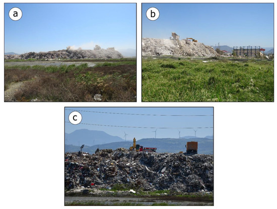 This disposal site is located just 20 m southwest of the above field, 30 m from the coastal road, and 150 m from the coastline (Figure 4). During our field survey in the southernmost end of the earthquake-affected area in early May 2023, we found that due to the continuous dumping of debris from the earthquake at this location, a wide and high pile had been formed (Figure 5a). It was higher than the adjacent stand of the stadium (Figure 5b), while it also occupied a large part of the marshy area west of the field (Figure 5a,c).