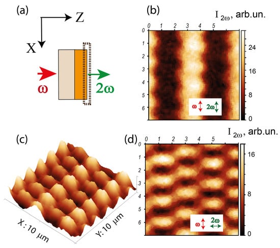 Figure 2a). In that case, the SHG response at the wavelength of 425 nm is formed by the surface layer of 2–3 μm in thickness (determined by the escape length of the radiation at the SHG wavelength), which allows the study of the surface domain structure of garnet film at this hidden interface.