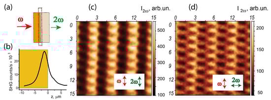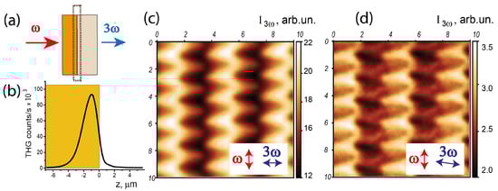 Figure 4b shows that the effective thickness of the layer contributing to the third harmonic generation is about 2 μm, which is less than for the case of the SHG scheme due to the higher-order nonlinearity of the process. Similarly, higher in-plane resolution of the THG probe is attained.