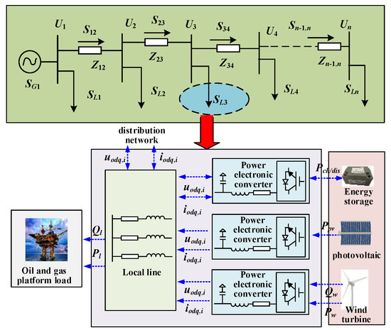 In Figure 1, SG1 is the apparent power of the upper distribution network, Zi−1,i denotes the line impedance from node i − 1 to node i, Ui is the voltage of node i, Si−1,i is the line-flow power from node i − 1 to node i, Si is the apparent injection power of node i, and SLi is the sum of the load power Pl/Ql of node i and the connected power of the distributed generation units. WT/PV ES and other distributed generation units are connected to the local line through the power electronic converter and supply power to the load of the offshore oil–gas platform, together with the distribution network. The excess renewable energy can also be transmitted through the distribution network to supply power for other loads.