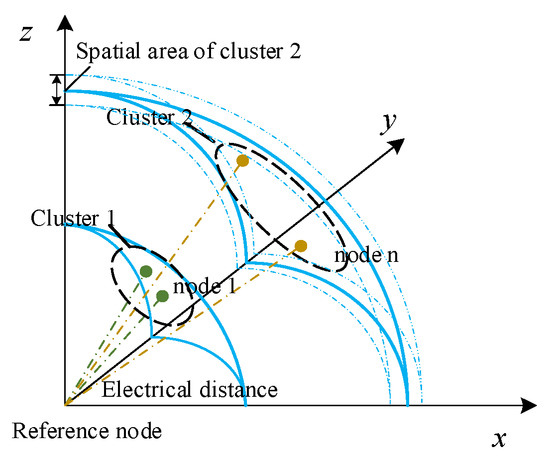 The partition of a power-system cluster is based on the electrical distance between each node and the slack bus, and the nodes with similar distance to the slack bus are classified into one category. Therefore, the entire distribution network is partitioned into multiple voltage-control clusters, as shown in Figure 3. The nodes in each cluster have close electrical coupling. For the control of distribution network node voltage and loss, after the cluster is partitioned, it can be more effective; at the same time, it can also more effectively improve the matching of the timing of power and voltage stability within each cluster.