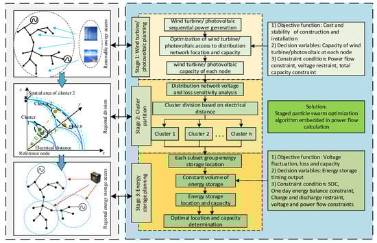 Recently, many scholars studied the method of WT/PV ES for distribution networks and proposed a variety of distributed generation (DG) and ES optimization methods. In [7], the siting and sizing of DG were divided into two levels. The first level considered line losses and voltage fluctuations and the second level considered the income of operators. In [8], an PV ES-capacity-optimization model was established with the goal of optimizing the loss-of-load probability and the energy-overflow ratio, but the influence of line loss was not considered in the capacity planning. In [9], a distribution network with numerous nodes was divided into clusters. That study proposed an initial planning of the capacity of each cluster, with the cluster as the unit and a reduction in the comprehensive cost as the goal, followed by the planning of the capacity of each node, with the node as the unit and reducing line loss as the goal. In [10], a heuristic strategy based on voltage sensitivity was proposed to realize the optimal planning of ES to solve the voltage-limit violation of a distribution network upon the connecting of DG to the distribution network. A particle swarm optimization (PSO) algorithm was employed in [11,12,13,14] to determine the location and capacity of a single DG unit or multiple DG units, focusing on optimizing voltage fluctuation and line losses. However, ES was not considered. A model was developed in [15] to optimize ES capacity planning by considering investment costs and battery lifespan to achieve overall economic efficiency. An improved particle swarm optimization (IPSO) algorithm was used in [16] to optimize energy storage capacity, with the objectives of minimizing voltage fluctuations and enhancing economic factors. However, the siting of ES was not considered. A model based on multiple scenarios for siting and sizing for PV and ES planning was established in [17], and the planning problem was solved by a centroid opposition-based learning-particle swarm optimization (COBL-PSO) algorithm; however, that study did not consider multiple forms of DGs.