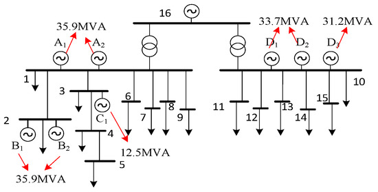 The 10 kV system of an oilfield in the Bohai Sea of China was analyzed. The system grid consisted of 16 nodes. Node 16 belonged to the 35 kV distribution network and the other 15 nodes were of 10 kV, as shown in Figure 5. The whole system was connected to the higher-level distribution network through submarine cables. The total load of the network was 103.892 MW and the load of the entire oil field hardly changed over time. Under the existing working conditions, among the eight (total) gas turbines, six were designated for use and two for standby, which were able to meet the power-load consumption of the whole oilfield with the output of the higher-level distribution network. The system structure is shown in Figure 5.