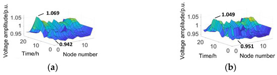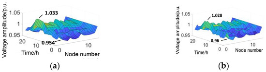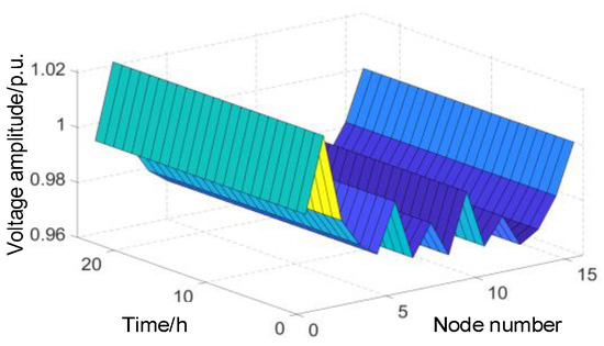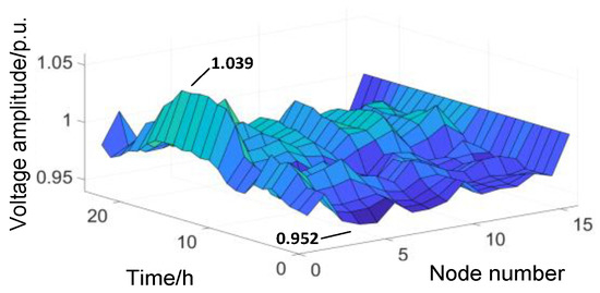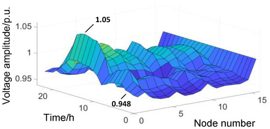 The total WT capacity was 70 MW and the total PV capacity was 24 MW. Based on the optimized WT/PV capacity and the predicted output curves, power-flow calculations were performed during each time period. The power-flow distribution result is illustrated in Figure 9, where the x-axis represents the node number, the y-axis represents the per-unit voltage of the node, and the z-axis is the time measured in hours.