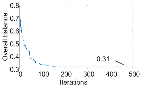 The output power of the original gas turbine was reduced proportionally and, simultaneously, renewable energy such as wind and solar were incorporated. Considering that the economic and stability indicators were equally important, ξ1(x) and ξ2(x) were each assumed to be 1. When the gas-turbine output decreased by 50%, the optimization curve of the overall WT/PV was as shown in Figure 7. With the increase in the number of iterations, the overall balance decreased, and the optimal scheme which was acceptable to each optimization goal was reached. Considering the different capacities at each node, the WT/PV planning results obtained, based on varying output curves for WT/PV systems, are shown in Figure 8.