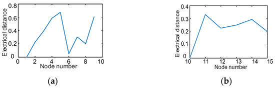According to the capacity after WT/PV planning and the load distribution of the distribution network, the second stage of cluster partition was carried out. Based on node 1 and node 10, the electrical distances between nodes 2–9 and 1 and between nodes 11–15 and 10 were calculated. The results are presented in Figure 10, where the x-axis indicates the node number and the y-axis indicates the electrical distance between each node and the reference node.