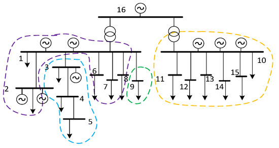 Based on the electrical distance between nodes, we grouped together nodes whose electrical distance did not exceed 0.4 and partitioned them into sub-clusters. Nodes 1, 2, 6–8, nodes 3–5, node 9, and nodes 10–15 were partitioned into four sub-clusters, as shown in Figure 11.