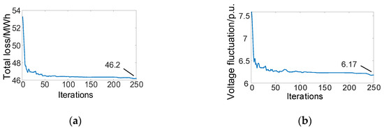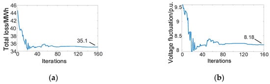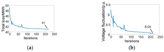 According to the operation state, the power penetration of the system was calculated as 62.80%. Since the load hardly changed, the power penetration and the capacity penetration were always the same. The energy penetration was 39.42% and the stability indicator was 0.057. The maximum values of the node voltage before and after the ES connection were 1.05 and 1.039, respectively, and the minimum values were 0.948 and 0.952, respectively. The fluctuation was significantly reduced. The single-objective optimization process of loss and voltage fluctuation in the total objective is shown in Figure 13. The losses before and after the ES connection were 49.1 MWh and 41 MWh, respectively, and the total voltage fluctuation of all the nodes’ indicators before and after the ES connection were 9.23 and 8.04, respectively. Each objective was optimized through iteration.