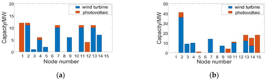 WT/PV planning results: (a) WT/PV planning results after 30% reduction in gas-turbine output power; (b) WT/PV planning results after 70% reduction in gas-turbine output power.