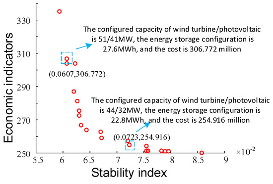 According to initial investment budget, when planning WT/PV, considering the economic indicators (in millions of yuan) and stability, the ES is planned to be 30% of the total WT/PV capacity. The multi-objective particle swarm optimization algorithm embedded in the power flow calculation was used to obtain the Pareto optimality-of-economic-and-stability indicator, when the investment budget was limited between RMB 250 million and RMB 350 million (approximately USD 60 million), as shown in Figure 19.
