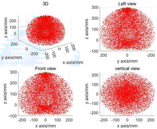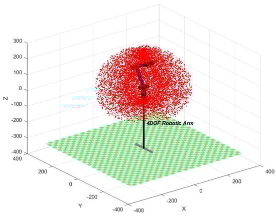 The basic joint model can be found in Figure 2. Once the model has been established, the workspace of the joint model can be determined by the Monte Carlo method [19,20]. In this section, the Monte Carlo method is used to solve the workspace as follows [21]: firstly, random variables are generated for each joint, and a random set of joint space vectors are generated for the robotic arm, which is calculated by using 10,000 points. Secondly, the kinematic positive solution is calculated and mapped from the joint space to the end workspace (Cartesian coordinate system), and finally, the result is plotted in Figure 3. It can be seen from Figure 3 that the result of the arm motion contains any coordinate in the 3D space, which shows that the designed robotic arm can reach any specified point in the actual work. After the arm has been modeled, a kinematic analysis of the arm is carried out, including both positive and negative kinematics.