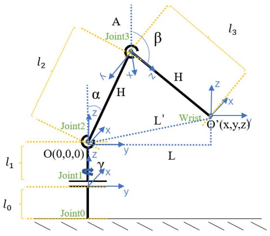 In contrast to the positive kinematic analysis of the arm, the inverse kinematic analysis of the arm uses calculations to solve for the angle of rotation at each joint when the relevant parameters of the connecting rod and the position of the end of the arm concerning the reference coordinate system have been obtained [23]. Geometric analysis based on the structure of the robotic arm: for the robotic arm involved in this paper, it is necessary to find the angle of rotation at each joint when the end of the robotic arm is moved from O to O′, i.e., to find γ, α, and β, according to the inverse kinematics requirements.
