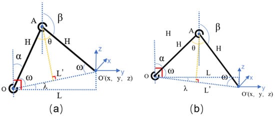 where ω is the angle formed by the robotic arm OA and L′ in space and λ is the angle formed by L and L′ in space. Therefore, it can be obtained that, at z > 0, when the end of the robotic arm moves to O′, the angle α that the robotic arm polar coordinates need to be rotated is