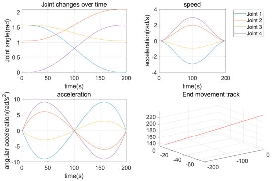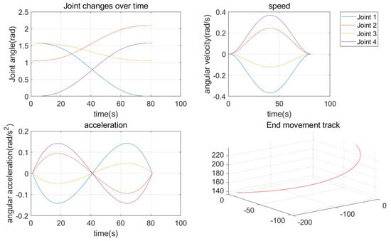 After analyzing the forward and reverse kinematics of the robotic arm, to ensure that the trajectory of the robotic arm can meet the design requirements of fast response, low motion inertia, and easy control when working, the joint space trajectory planning and Cartesian space trajectory planning for the model are carried out for a robotic arm reaching the one point from another point in space using two algorithms, respectively, as shown in Figure 7 and Figure 8.