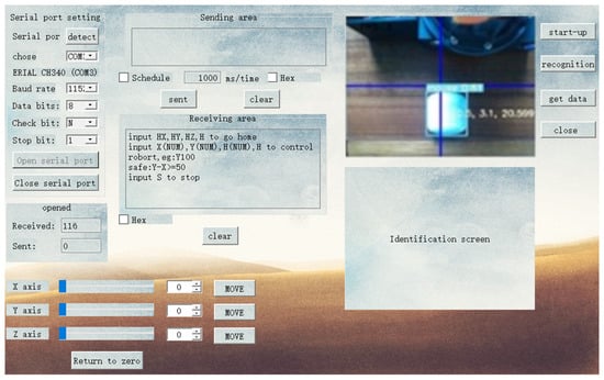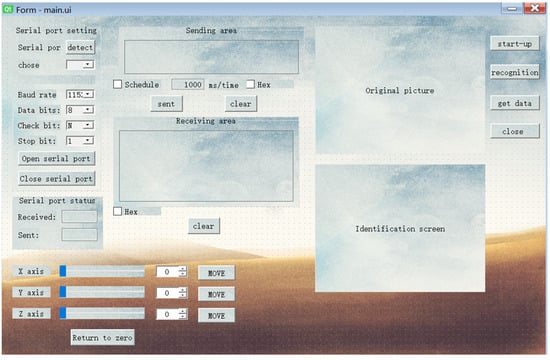 To control the work of the lower computer, the upper computer software based on the QT software development platform is compiled using the Python language. PYQT is the implementation of the QT library in Python, which is a convenient interface for Python programming and thus enables graphical interface programming. The basic interactive interface was designed in conjunction with the actual requirements of the robotic arm control system by taking into account factors such as efficient collaboration between software subsystems, reasonable interface layout, user-friendly interaction, and user habits, as shown in Figure 10.