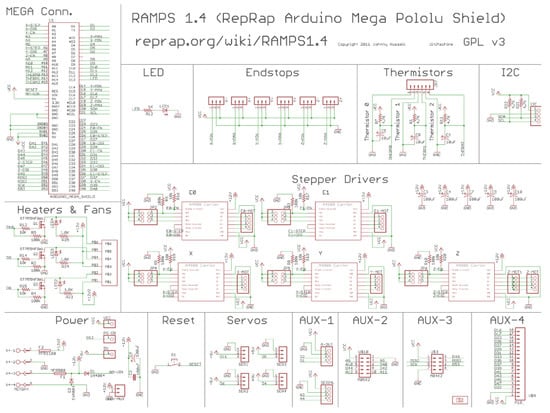 The main function of the motor driver is to regulate the subdivision and control the motor. Ramps are powerful Arduino expansion boards with multiple functional interfaces such as a 12,864 screen interface, 5 stepper motor interfaces, temperature control, limit switch interfaces, etc. Its circuit schematic diagram is shown in Figure 11.