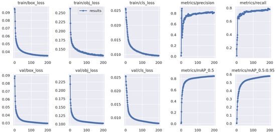 After the dataset is divided, the images in the dataset need to be trained. First, YOLOv7 is downloaded, and data inference is performed on a cloud-based server to ensure the inference rate. The parameters of the server are pytorch1.10, python3.8, CUDA11.3, RTXA4000 GPU, 16 GB video memory, 12-core Intel(R) Xeon(R) Gold 5320 CPU @ 2.20 GHz, and 32 GB memory. According to the above server configuration, the corresponding training parameters are set. The main parameters include input image size (640 × 640), number of training iterations (200), batch size (16), learning rate (0.01), and momentum (0.937). The changes in various values during the training process as the number of iterations increases is shown in Figure 13. It can be seen from Figure 13 that after 200 training iterations, the values of high precision and recall do not fluctuate greatly, and the changes in each value tend to be smooth, indicating an excellent training result.