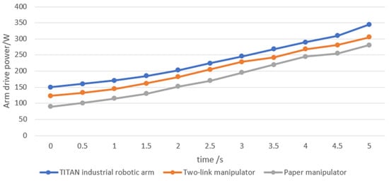 Next, to evaluate the power consumption performance of the robotic arm, under the same working conditions, we use the rotation center of the big arm as the system origin (0, 0, 0), and make the end of the robotic arm move from point (100, 100, 0) to point (200, 100, 0) at a movement speed set to 200 mm/s and a set load of 1000 N and compare the driving power of the three robotic arms, as shown in Figure 16. It is obvious that the driving power of the robotic arm designed in this paper is less than the other two robotic arms, so our robotic arm has the feature of low power consumption.