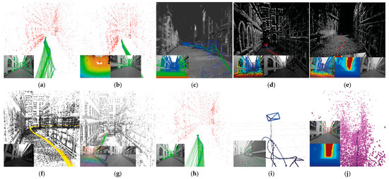 Examples of each indoor algorithm sequence execution seq-01—TUM-Mono dataset. The implemented methods were: (a) ORB-SLAM2, (b) DF-ORB-SLAM, (c) LSD-SLAM, (d) DSO, (e) CNN-DSO, (f) LDSO, (g) DSM, (h) DynaSLAM, (i) SVO, and (j) CNN-SVO.