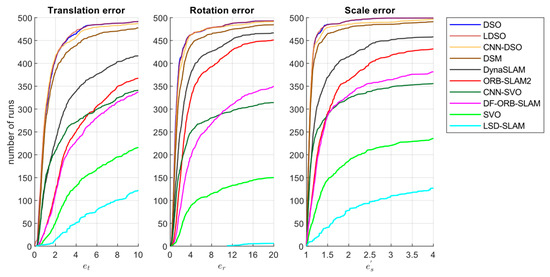 where is the distorted radius . As suggested in [6], to make a fair comparison based on the accumulated drift over the aligned start and end sequences, we disabled the loop closure for the SLAM methods ORB-SLAM2, DF-ORB-SLAM, DynaSLAM, LDSO, and DSM. Figure 4 presents each algorithm’s cumulative error plots for the translational, rotational, and scale errors. These graphs depict the number of runs for each error type below a certain x-value. Hence, the methods close to the top left corner were better because they reached a determined error value after more executions.