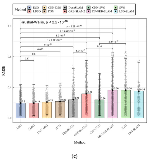 Comparing those studies, we tested ten methods following a taxonomy to test whether the newer versions improved their previous performance and to identify the advantages and disadvantages in the entire taxonomy. We also provided a complete inferential statistical analysis of each method’s performance, not only their median values. In addition, we included machine-learning-based versions of the classic methods in our comparison. One of the most recent related works was the study of [41], which explored the state-of-the-art classification and tested visual and visual–inertial algorithms in the ERoC benchmark. In that work, the authors briefly overviewed the existing methods and reviewed the classic classification of direct, feature-based, and RGB-D methods, adding DSO, ORB-SLAM2, and Vins-Mono methods to their comparison. In contrast, this comparison is focused only on monocular RGB methods; so, we followed an appropriate taxonomy for monocular RGB SLAM and VO systems. In addition, we used the TUM-Mono benchmark and its metrics, which is a broader and more complete benchmark.