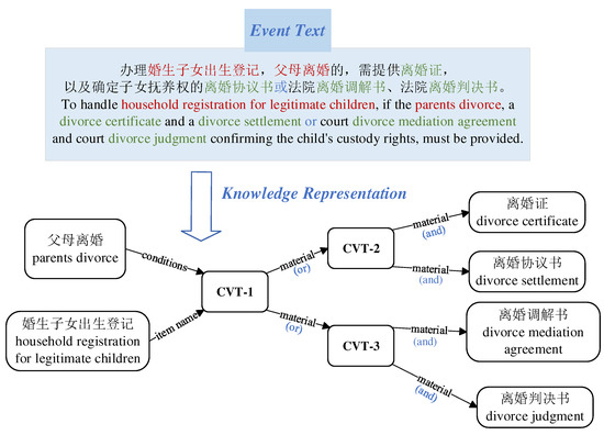 Example of CVT nodes representation. In the event of household registration for children born within marriage, when the parents divorce, they can choose to provide either one of two sets of documents for registration. One set includes the divorce certificate and divorce settlement, and the other set includes the divorce mediation agreement and divorce judgment. This text involves the use of ‘and’ and ‘or’ relationships, which are difficult to express in conventional triple formats, but CVT nodes can handle it effortlessly.