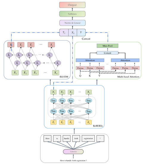 In this paper, recognizing the intention of the question was considered a text classification task. We constructed the RBMA model as a classifier that parses and classifies the intention of the question. The model classifies the question process by: encoding input texts semantically using the Robustly Optimized BERT Pretraining Approach (RoBERTa) to obtain the word vector representations of each word; inputting the word vector sequence into a bidirectional long short-term memory (BiLSTM) to capture the contextual semantic information of the sentence; and then using a multi-head attention mechanism (MHA) to extract the essential information from the text [37]. Finally, the classification (CLS) vector representing the entire sentence’s semantic is concatenated, and a fully connected layer maps the CLS vector to a predefined set of labels to obtain the text’s classification result [38]. The model structure is shown in Figure 5, and the intention category is ultimately obtained through question parsing.