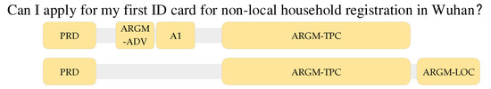 The LTP performs semantic role labeling and extracts semantic roles present in interrogative sentences. To illustrate, we take the question ‘Can I apply for my first ID card for non-local household registration in Wuhan?’ as an example. Figure 6 shows the analysis result of the LTP for this question, which provides a list of semantic labeling results: